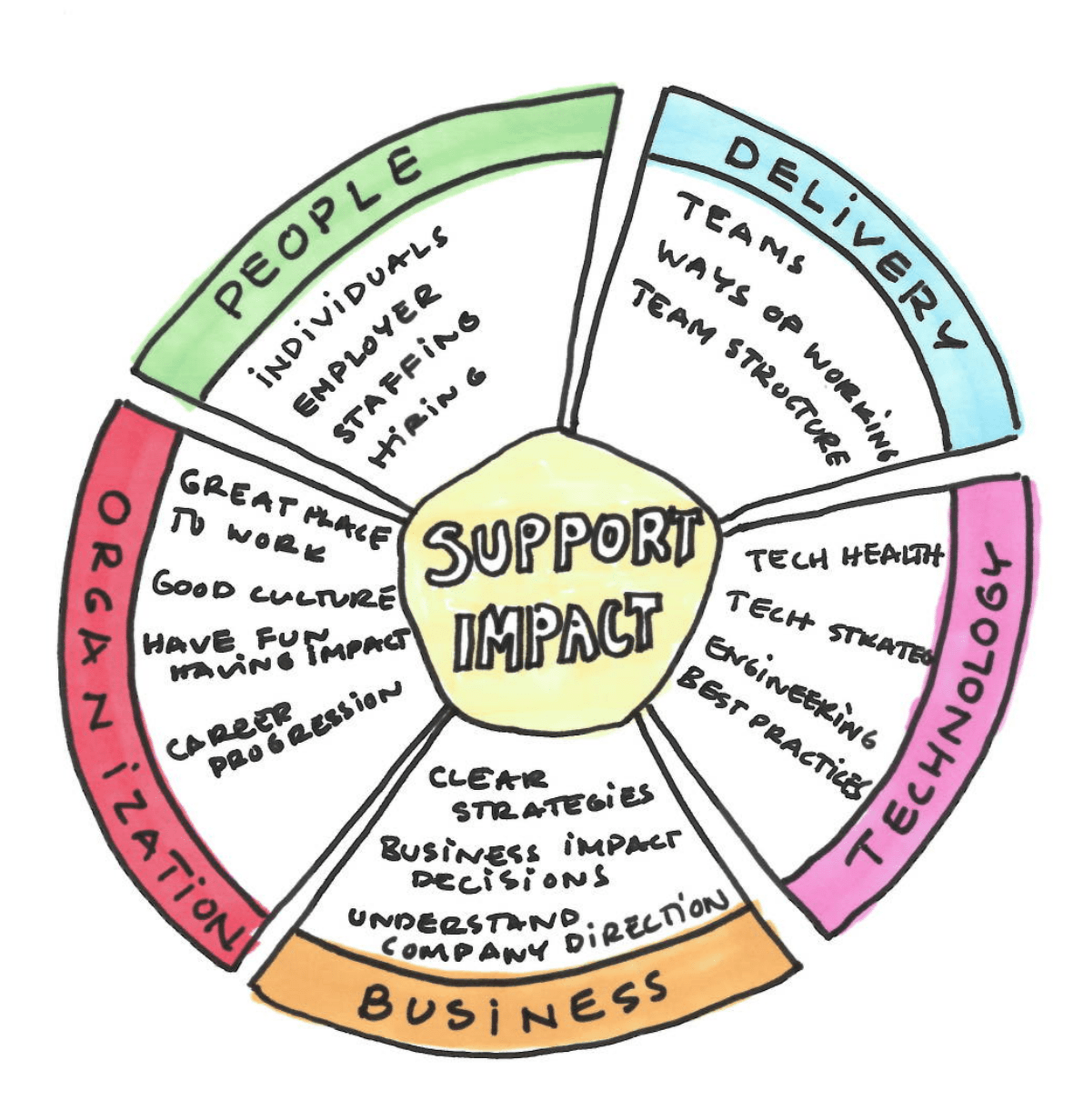 Drive change when needed. When things are not working properly we might need to help individuals through driving change initiatives that will improve the situation. The changes needed could be anything and depending on the organization and your sphere of influence the actions you take will wary. Read more about driving technical change in this post, it might be helpful even if you are not about to drive a technical change.