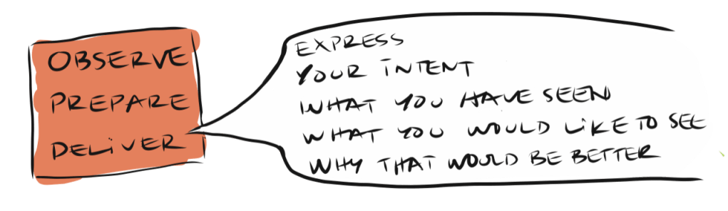 When sharing your observations and opinions as feedback you need to be specific. You need to help the person understand what you mean and give concrete examples to clarify your statements. To support the change you are after your feedback has to be actionable so that the actions you want to encourage can be repeated and the actions you don’t want to see can be avoided in the future.