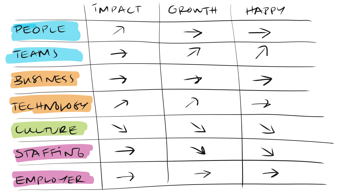 - Technology. How happy are you with the current state of tech for the people and teams you are working with? How happy are the users of your systems or other teams depending on your technology?